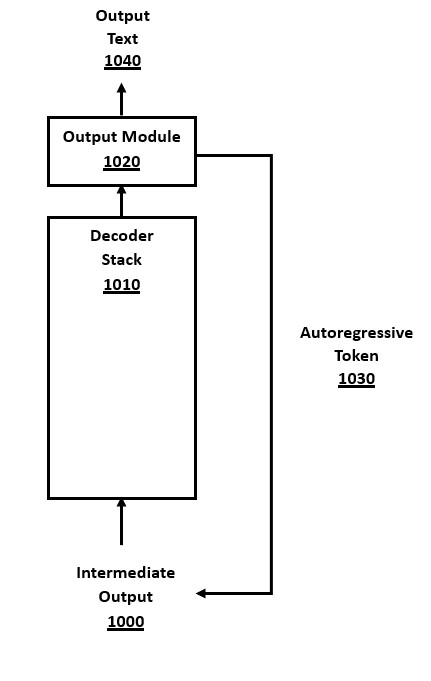 In addition to forwarding the new token to be used autoregressively, the output module 1020 may convert the token to text, and add it to the output text 1040. With simple decoding algorithms such as greedy decoding, the text is output immediately. In more advanced decoding algorithms, such as beam search decoding, the text output is deferred until the decoding algorithm makes additional computations as to which token or token sequence to finally output.