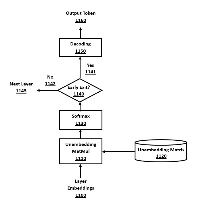 If the early exit test 1140 fails, then the No pathway 1142 is executed, which continues execution of the next decoder layer 1145. If the early exit test 1130 has decision criteria that only consider the current layer of logits, then the outputs of the unembedding module 1110 and Softmax module 1130, if any, are discarded, which is an inefficiency. However, these values may be retained in memory for use in a future test by the early exit test module 1140, if the early exit decision criteria involve probabilities from prior layers. If the early exit criteria are simplistic tests not involving logits, such as a fixed number of layers, then there are no values computed by the unembedding module 1110 and Softmax module 1130, and nothing needs to be stored.