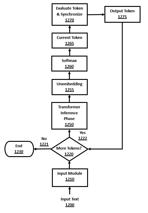 Several modules in FIG. 12 have already been shown in other prior figures and their descriptions. The details of the input text 1200 and input module 1210 have been described in FIG. 4. The details of the unembedding module 1255 and the Softmax module 1260 have been described in FIG. 5 and the associated description of the output module. The details of the output token module 1275, including the output of text, and the autoregressive decoding pathway, have been described in FIG. 5 and FIG. 10.