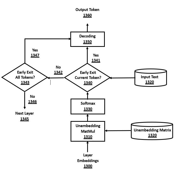 The all-tokens early exit module 1343 has already been described, including versions requiring all logit probabilities and simpler versions not requiring any probabilities. The all-tokens early exit module 1343 may have any or all of the features described for the early exit decision module 1140 in FIG. 11.