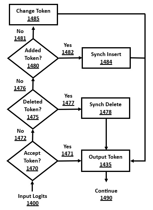 As discussed above, the logic of the inserted or added token test 1480 is deferred until after at least one further decoding cycle. The Yes pathway 482 indicates that an inserted token has been detected, and this can be processed and post-insertion re-synchronization can occur as discussed above. Similarly, if a change correction is detected, then post-change re-synchronization can occur, which doesn't alter the positioning, but can at least turn off the unsynchronized mode if the token sequences are matching again. Until there is extra tokens from one or two decoding cycles, the decoding algorithm enters an unsynchronized mode that can be recovered when either a change or insertion is confirmed. If neither a change nor an insertion is detected in future tokens, the worst case is the decoding algorithm remains permanently in the unsynchronized mode, and simply outputs the model's predicted output tokens.