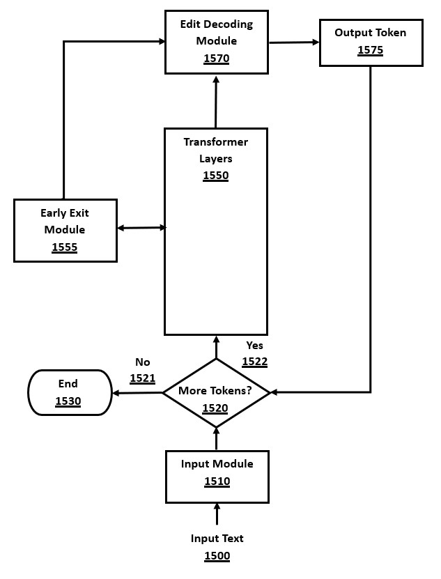 FIG. 15 is a flow-chart of a method for integrating edit decoding and early exit in a transformer, in accordance with a number of embodiments of the present disclosure. FIG. 15 is an extension of the novel edit decoding method (FIG. 12) with an early exit module 1555, including various possible embodiments of prior art methods for early exit methods, and the details of the early exit method were shown in FIG. 11. The early exit module 1555 can send the output to the edit decoding module 1570 if it decides to early exit. If no early exit is triggered, then the edit decoding module will get the output results after all transformer layers 1550 have executed.
