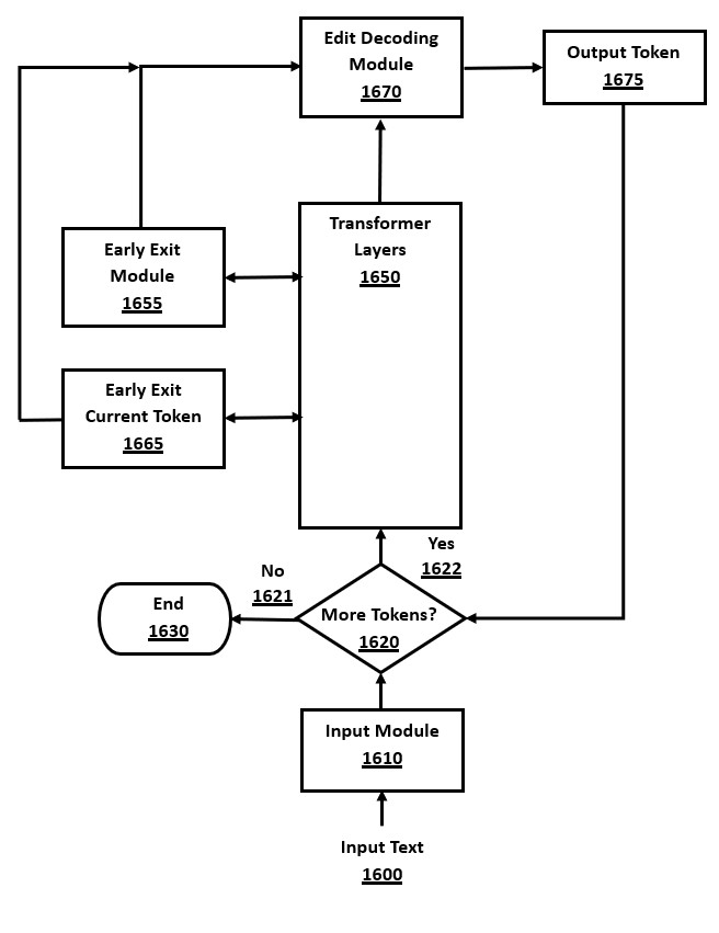 FIG. 16 is a flow-chart of a method for integrating edit decoding and early exit optimized with current input token decision logic, in accordance with a number of embodiments of the present disclosure. FIG. 16 shows the addition of the current input token decision logic into the early exit module of the system in FIG. 15, which shows a system combining edit decoding and early exit. This shows all of the main novel components of the present disclosure used together as one possible embodiment. Many of the components in FIG. 16 are analogous to those with similar suffix numbers in FIG. 15. The current input token decision logic module 1665 offers a second, and more efficient, way to decide to early exit from the layers in the decoder 1650. This decision logic method using the current input token is shown in detail in FIG. 13.