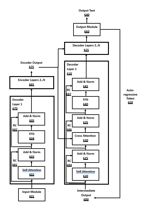 The first steps of this method shown in FIG. 6 occur in the input module 601, which converts input text formats into numeric tokens and then into an embedding vector internal format, which is used for computations in encoder layers and decoder layers. The input module 601 is as shown in detail in FIG. 4 and the corresponding description.