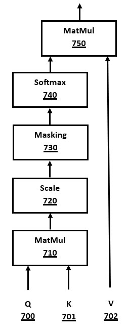 The computed output from the Scale module 720 is passed into the Masking module 730, which is an optional module that can be skipped in some methods. When activated, the masking prevents the attention computation from "lookahead" and limits computations for a token to tokens earlier in the token sequence.
