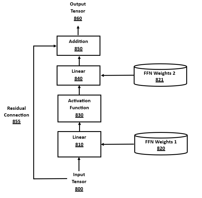 FIG. 8 is a block diagram of a Feed-Forward Network (FFN) module, also known as a Multi-Layer Perceptron (MLP), in accordance with a number of embodiments of the present disclosure. The FFN components are heavy computation phases in the transformer engine execution. The basic architecture of the FFN involves sending the FFN input tensor data 800 to a first linear layer 810 (using the first set of FFN weights and biases 820), an activation function module 830, and then a second linear layer 840 (using the second set of FFN weights and biases 821). Finally, there is an addition module 850 using the data from the FFN input tensor 800 via residual connection 855.