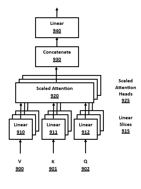 FIG. 9 is a block diagram of a Multi-Head Attention (MHA) module, in accordance with a number of embodiments of the present disclosure. This MHA method is a well-known optimization to the QKV attention computations in FIG. 7 The use of a MHA architecture facilitates parallelization of the computations in an attention block, such as a self attention block or cross attention block. The computation is split across H different blocks called "attention heads." Parallelized computation allows faster execution on GPU hardware or software threads.